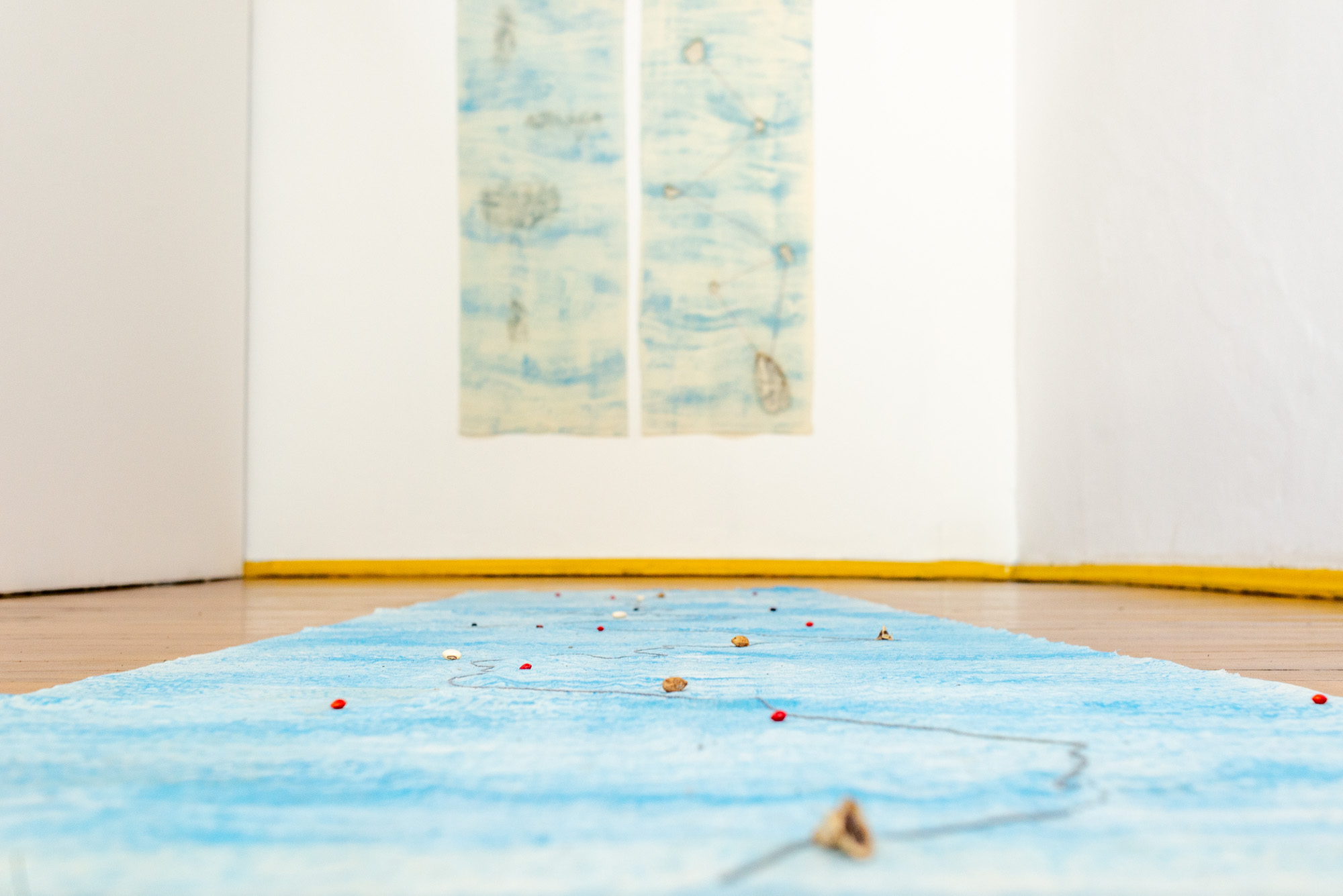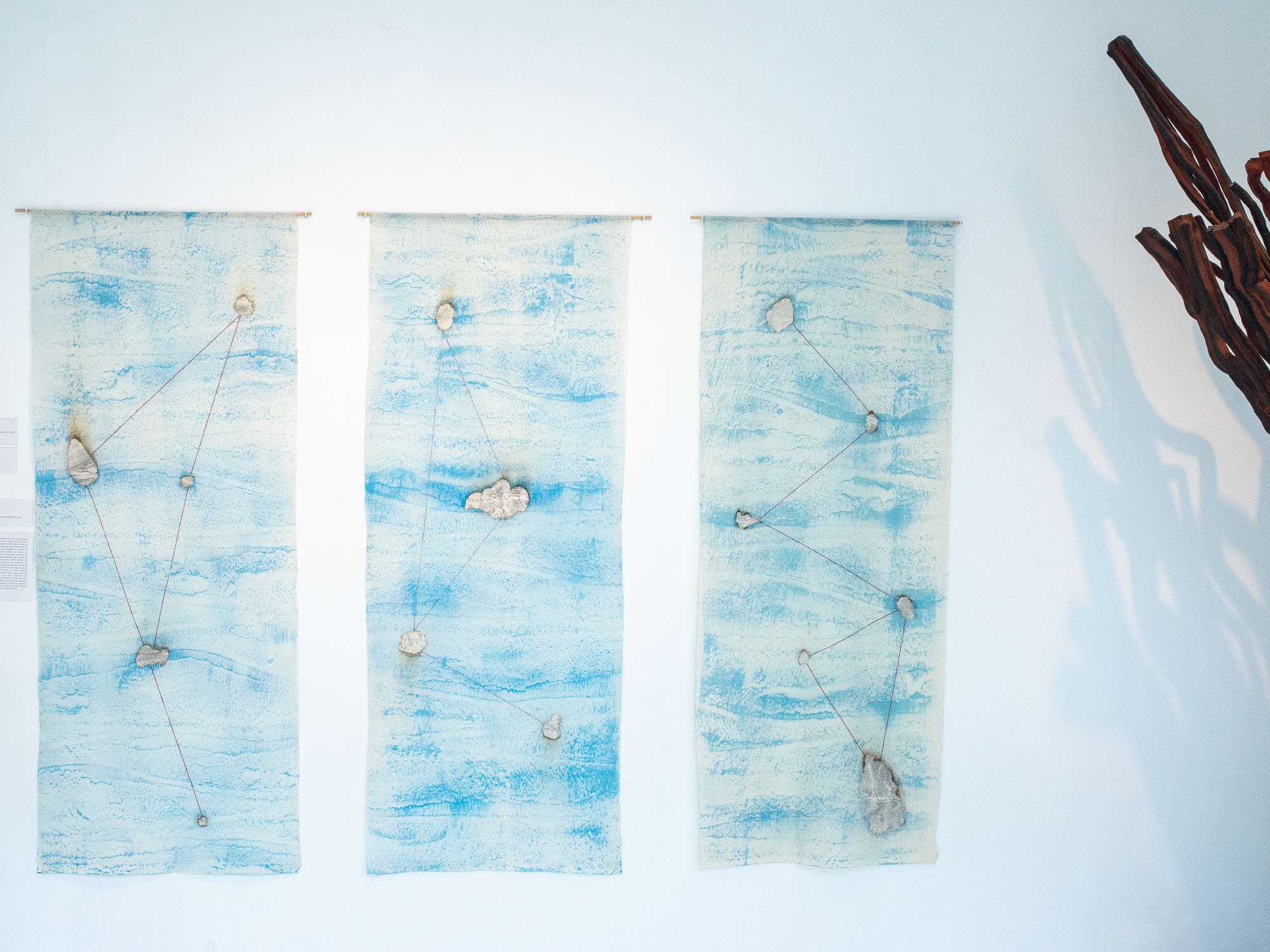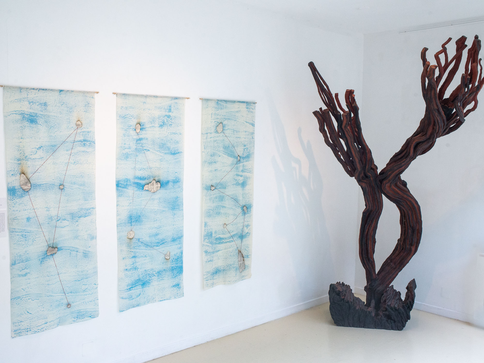 Silkscreen prints of my hand lifelines, using a clay-based ink, are superimposed onto these surfaces, merging human traces with vegetal imprints.